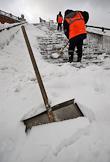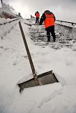 Последствия сильного снегопада в Москве. Сотрудники коммунальной службы чистят снег на лестнице.