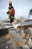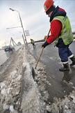 Последствия сильного снегопада в Москве. Сотрудники коммунальной службы чистят снег на тротуаре.