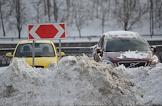 Жанровая фотография. Последствия снегопада в Москве. Заснеженные автомобили и дорожный знак в сугробе.