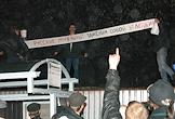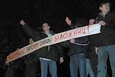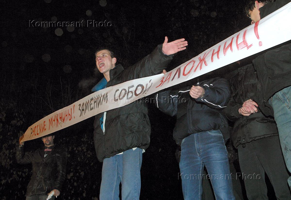В Москве 23 октября произошел захват террористами зрительного зала Дворца культуры (ДК) завода "Московский подшипник", в котором шла демонстрация мюзикла "Норд-Ост". Ответственность за захват 700 заложников взял на себя известный чеченский боевик Мовсар Бараев. Молодые люди с транспарантом "Русские мужчины! Заменим собой заложниц!".