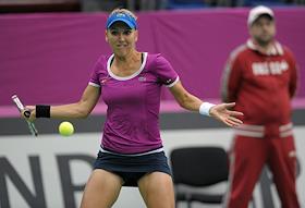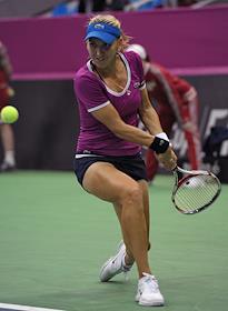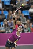Теннис. Кубок Федерации – 2013. Второй день. Теннисистка Елена Веснина (Россия) во время встречи с теннисисткой Аюми Морита (Япония) в матче 1/4 финала Мировой группы Россия - Япония в СК "Олимпийский".