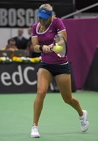 Теннис. Кубок Федерации-2013. Второй день. Теннисистка Екатерина Макарова (Россия) во время встречи с теннисисткой Кимико Дате-Крумм (Япония) в матче 1/4 финала между командами России и Японии в СК "Олимпийский".