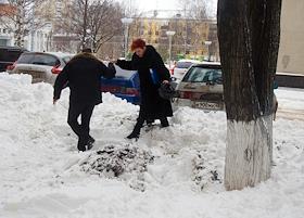 Виды города Кирова. Местные жители преодолевают сугробы на улицах города.