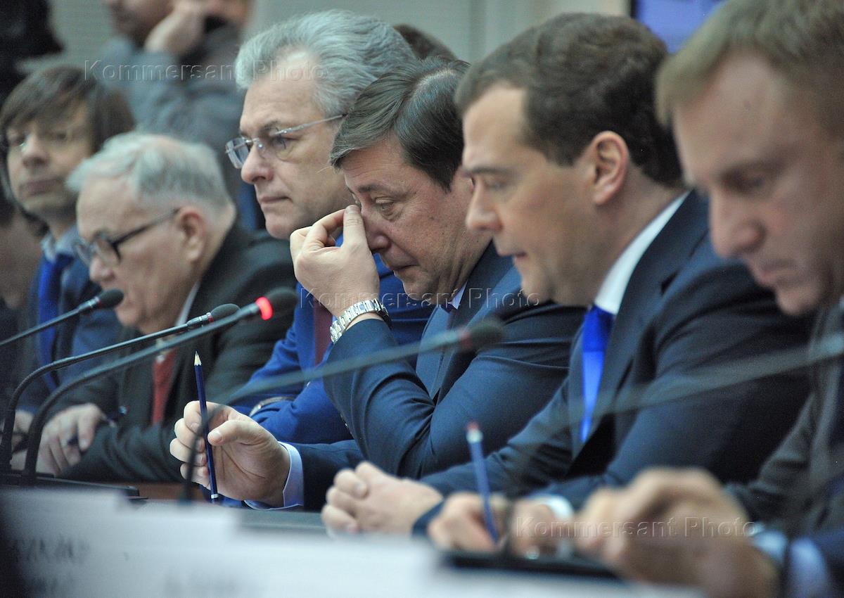 Председатель правительства России Дмитрий Медведев (в центре) на заседании попечительских советов Сибирского и Южного федеральных университетов. Заседание прошло в здании Научной библиотеки Сибирского федерального университета.