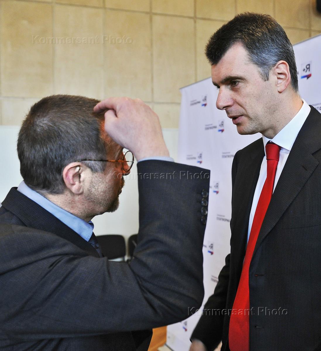 Актер Леонид Ярмольник (слева) и президент компании "Онэксим" и лидер партии "Гражданская платформа" Михаил Прохоров (справа) перед началом заседания Федерального гражданского комитета политической партии "Гражданская платформа".