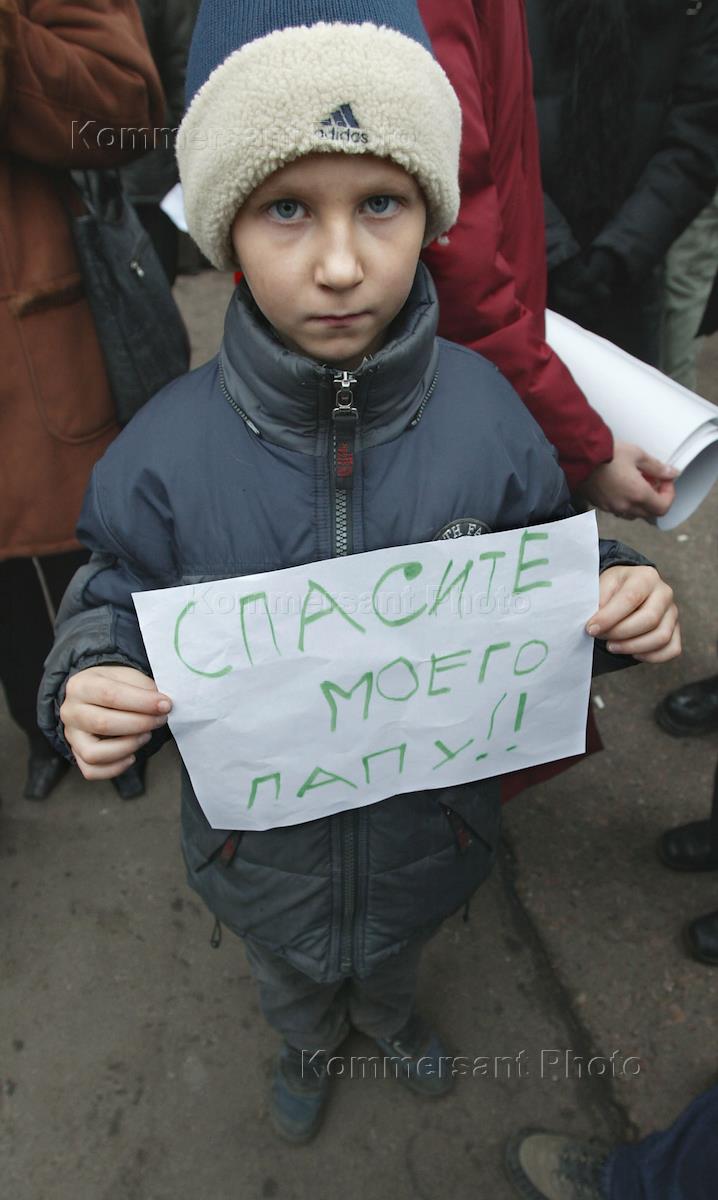 В Москве 23 октября произошел захват террористами зрительного зала Дворца культуры (ДК) завода "Московский подшипник", в котором шла демонстрация мюзикла "Норд-Ост". Ответственность за захват более 700 заложников взял на себя известный чеченский боевик Мовсар Бараев. Родные и близкие заложников во время митинга на Васильевском спуске. Девочка держит плакат с надписью "Спасите моего папу".