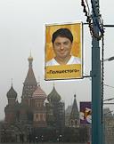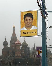 Рекламный плакат передачи "Полшестого" телеканала СТС с изображением её ведущего Александра Цекало на столбе Васильевского спуска. Александр Цекало является продюсером мюзикла "Норд-Ост". В Москве 23 октября произошел захват террористами зрительного зала Дворца культуры (ДК) завода "Московский подшипник", в котором шла демонстрация мюзикла "Норд-Ост". Ответственность за захват более 700 заложников взял на себя известный чеченский боевик Мовсар Бараев. Спецоперация штаба по спасению заложников началась ровно 5:30 московского времени 26 октября. После проведения успешной спецоперации штаба по спасению заложников 42 террориста было уничтожено, 751 заложник освобожден, более 90 заложников погибло в ходе операции.