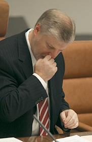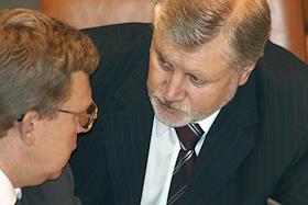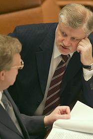 Заместитель председателя Правительства России, министр финансов Алексей Кудрин (слева) и председатель Совета Федерации (СФ) России Сергей Миронов (справа) во время заседания Совета законодателей. Заседание состоялась в здании СФ.