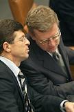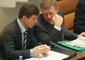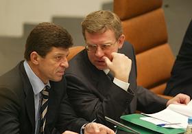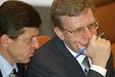 Заместитель руководителя администрации Президента России Дмитрий Козак (слева) и заместитель председателя Правительства России, министр финансов Алексей Кудрин (справа) во время заседания Совета законодателей. Заседание состоялась в здании Совета Федерации России.