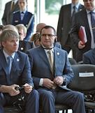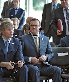 Официальный визит председателя правительства России Дмитрия Медведева в Бразилию. Заместитель министра спорта, туризма и молодежной политики России Павел Колобков (слева) и министр сельского хозяйства России Николай Федоров (в центре) во время встречи Дмитрия Медведева с президентом Бразилии Дилмой Роуссефф во дворце "Планалато".