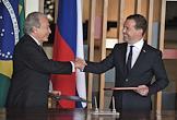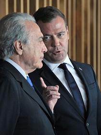 Официальный визит председателя правительства России Дмитрия Медведева в Бразилию. Вице-президент Бразилии Мишель Тимер (cлева) и председатель правительства России Дмитрий Медведев (справа) во время пресс-конференции по итогам VI заседания Российско-бразильской комиссии высокого уровня по сотрудничеству (КВУ).