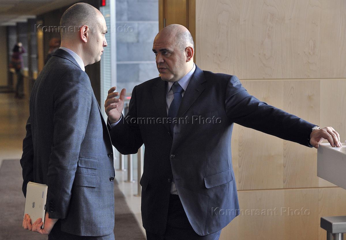 Руководитель Федеральной налоговой службы России Михаил Мишустин (справа) перед заседанием коллегии УФНС по Московской области, посвященным подведению итогов деятельности налоговой службы в 2012 году и задачам на 2013 год.