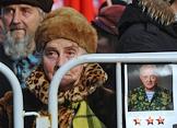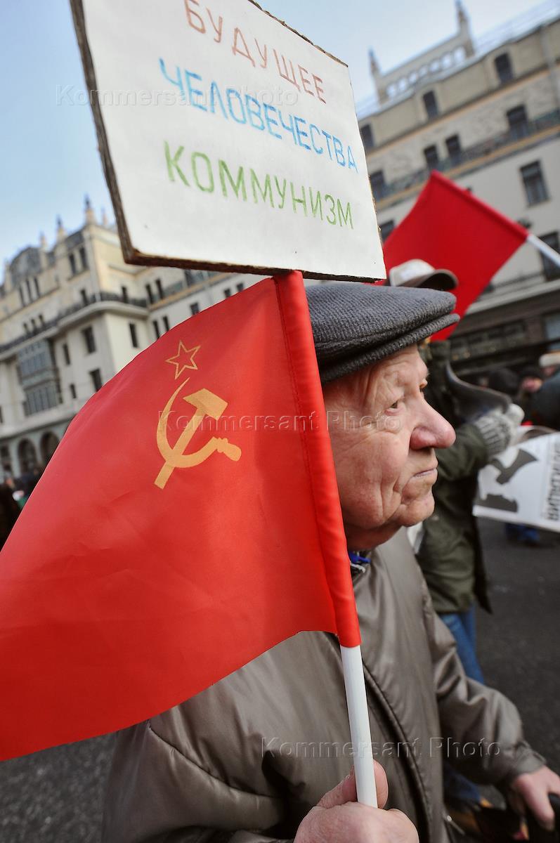 Шествие по случаю 95-летия Советской Армии и Военно-морского флота. Шествие, организолванное МГК КПРФ, Штабом протестных действий, Союзом советских офицеров и Движением в поддержку Армии, прошло от площади Пушкина до Театральной площади, где состоялся митинг. Плакат "Будущее человечества - коммунизм!".