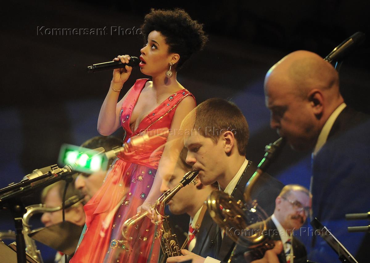 Певица из Австралии Фантине (Fantine) (в центре) и джазмен Игорь Бутман (справа) во время выступления на фестивале "Триумф Джаза-2013" в Светлановском зале Московского международного Дома музыки (ММДМ).