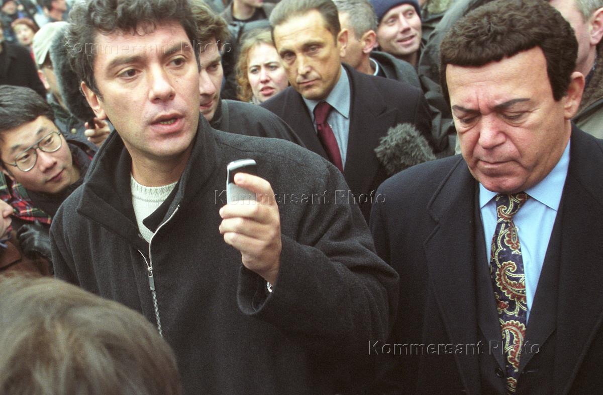 В Москве 23 октября произошел захват террористами зрительного зала Дворца культуры (ДК) завода "Московский подшипник", в котором шла демонстрация мюзикла "Норд-Ост". Ответственность за захват более 700 заложников взял на себя известный чеченский боевик Мовсар Бараев. Лидер партии "Союз правых сил" Борис Немцов (слева) и певец, депутат Государственной Думы России Иосиф Кобзон (справа) участвовали в переговорах с террористами.