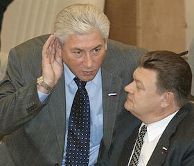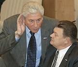 Заместитель председателя Комитета Государственной Думы России по регламенту и организации работы Государственной Думы Владимир Гребенюк (слева) на очередном думском заседании.