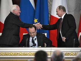 Президент России Владимир Путин (справа) и президент Франции Франсуа Олланд (в центре) во время церемонии подписания документов по итогам российско-французских переговоров.
