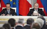 Президент России Владимир Путин (справа) и президент Франции Франсуа Олланд (слева) во время церемонии подписания документов по итогам российско-французских переговоров.