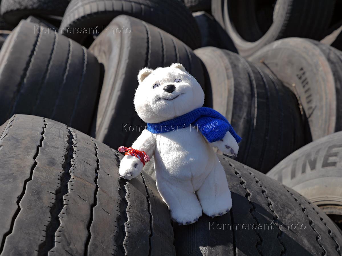 Skoda European Olympic capitals press-tour. Жанровая фотография. Символ Олимпиады "Сочи 2014" белый мишка ледит на автомобильных шинах.
