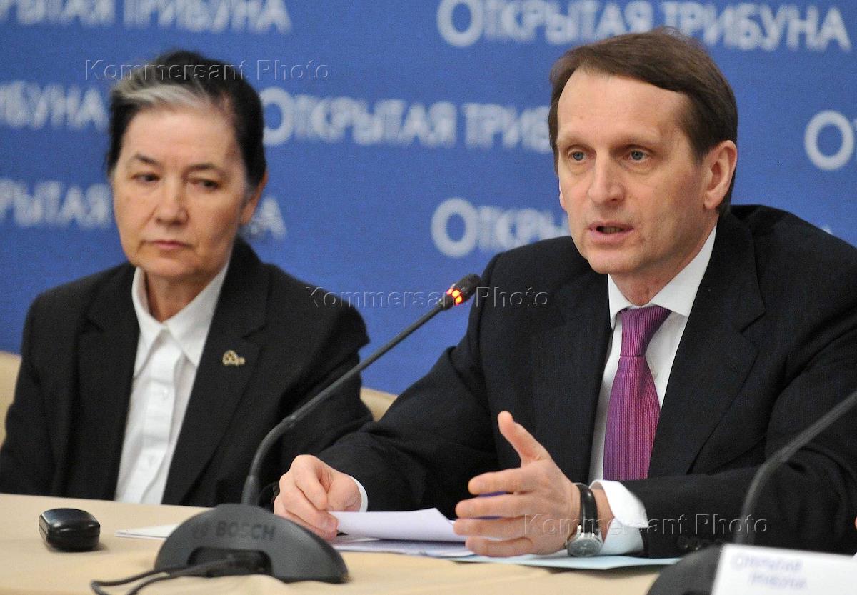 Председатель комитета Государственной думы (ГД) России по жилищной политике и жилищно-коммунальному хозяйству Галина Хованская (слева) и председатель ГД Сергей Нарышкин (справа) во время заседания Открытой трибуны на тему "Общественный контроль реформы ЖКХ". Заседание прошло в Государственной думе.