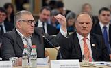 Лидер Либерально-демократической партии России (ЛДПР), член комитета Государственной думы (ГД) по обороне Владимир Жириновский (слева) и лидер Коммунистической партии России (справа) Геннадий Зюганов (справа) во время заседания Открытой трибуны на тему "Общественный контроль реформы ЖКХ". Заседание прошло в Государственной думе.