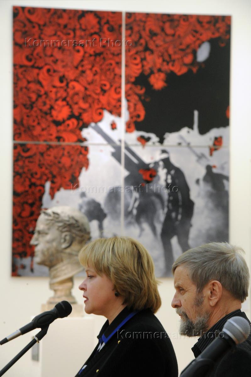 Художник Борис Орлов (справа) во время пресс-показа своей выставки "Фантомные боли" в Третьяковской галерее на Крымском Валу.