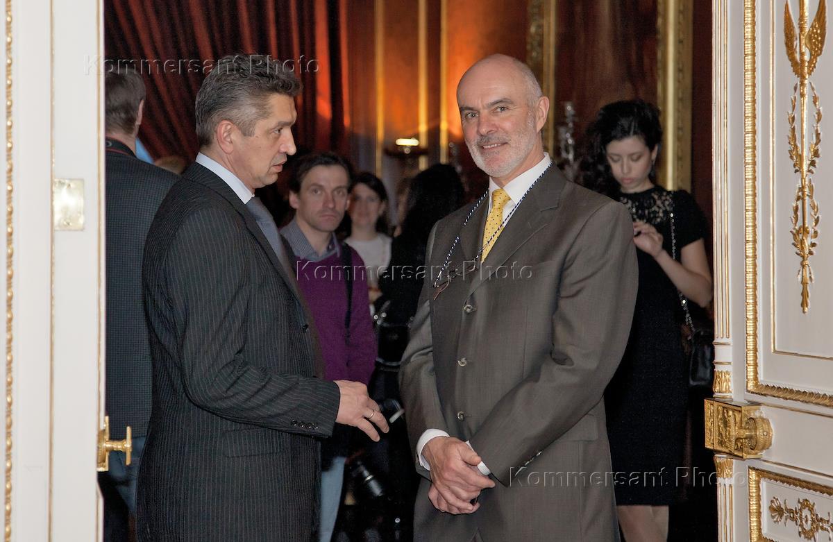 Менеджер резиденции посла Великобритании в Москве Кен Смит (справа) на Российской премьере автомобиля Aston Martin Vanquish в резиденции посла Великобритании.