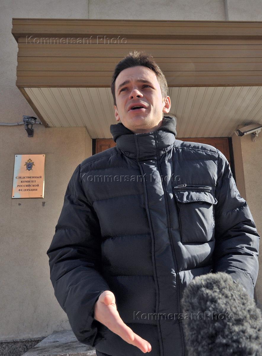 Член бюро движения "Солидарность" Илья Яшин у здания Следственного комитета России после допроса по делу обвиняемого в подготовке массовых беспорядков в России Леонида Развозжаева.