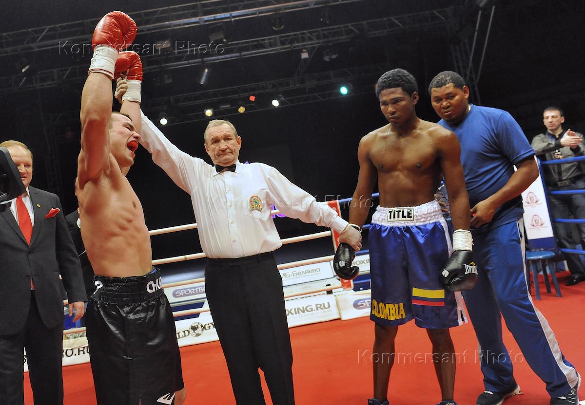 Боксер Дмитрий Чудинов после боя с боксером Милтоном Нуньесом за титул чемпиона по версии Пан-Азиатской боксерской ассоциации (PABA WBA) в СК "Крылья Советов".