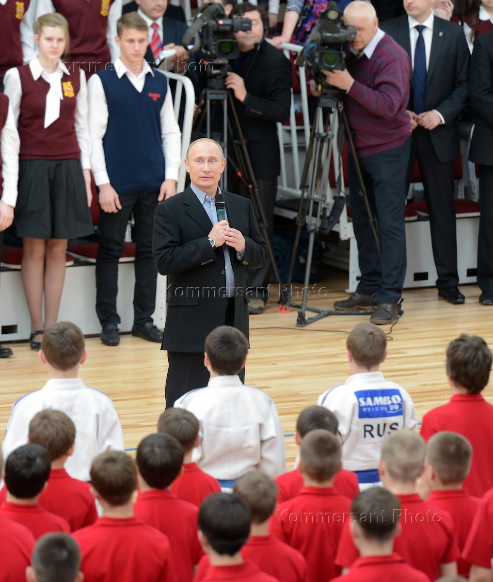 Russian President Vladimir Putin meeting with coaches, athletes, veterans and experts on the development in Russia of physical education of children and youth sport. The meeting was held at the Educational Center "Sambo-70".