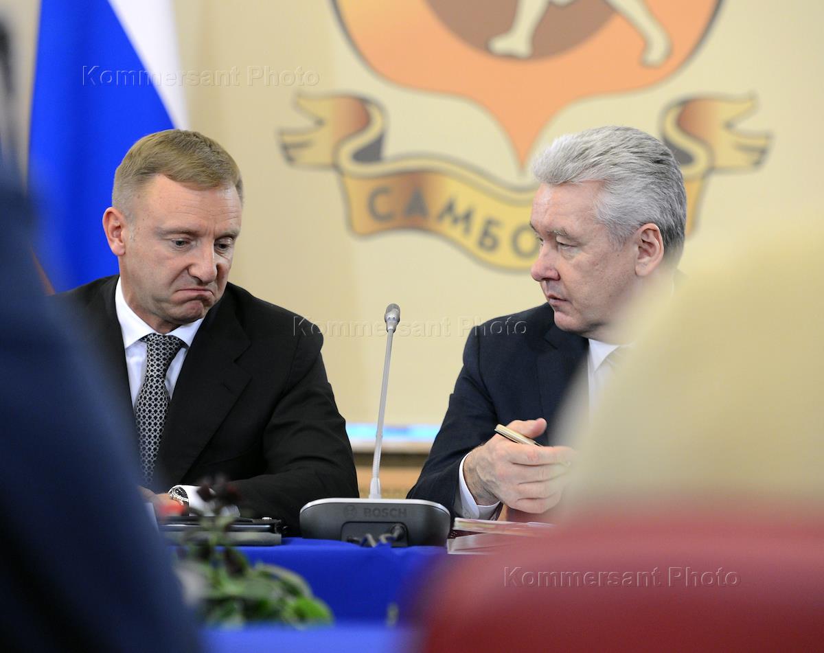 Minister of Education and Science RF Dmitry Livanov (left) and Moscow Mayor Sergei Sobyanin (right) at the meeting of the Council under the Russian President on International Relations. The meeting was held at the Jewish with coaches, athletes, veterans and experts on the development in Russia of physical education of children and youth sport. The meeting was held at the Educational Center "Sambo-70".