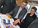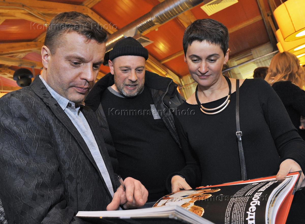 Журналисты Ольга Ципенюк (справа) и Максим Ковальский (в центре) на презентации шестого тома "Намедни" журналиста Леонида Парфенова (слева) в кафе "Булка" на территории Центрального парка культуры и отдыха им. М.Горького.