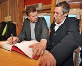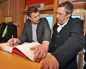 Певец Василий Обломов (справа) на презентации шестого тома "Намедни" журналиста Леонида Парфенова (слева) в кафе "Булка" на территории Центрального парка культуры и отдыха им. М.Горького.