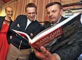 Председатель Координационного совета оппозиции (КСО) Алексей Навальный (в центре) с супругой Юлией (слева) на презентации шестого тома "Намедни" журналиста Леонида Парфенова (справа) в кафе "Булка" на территории Центрального парка культуры и отдыха им. М.Горького.