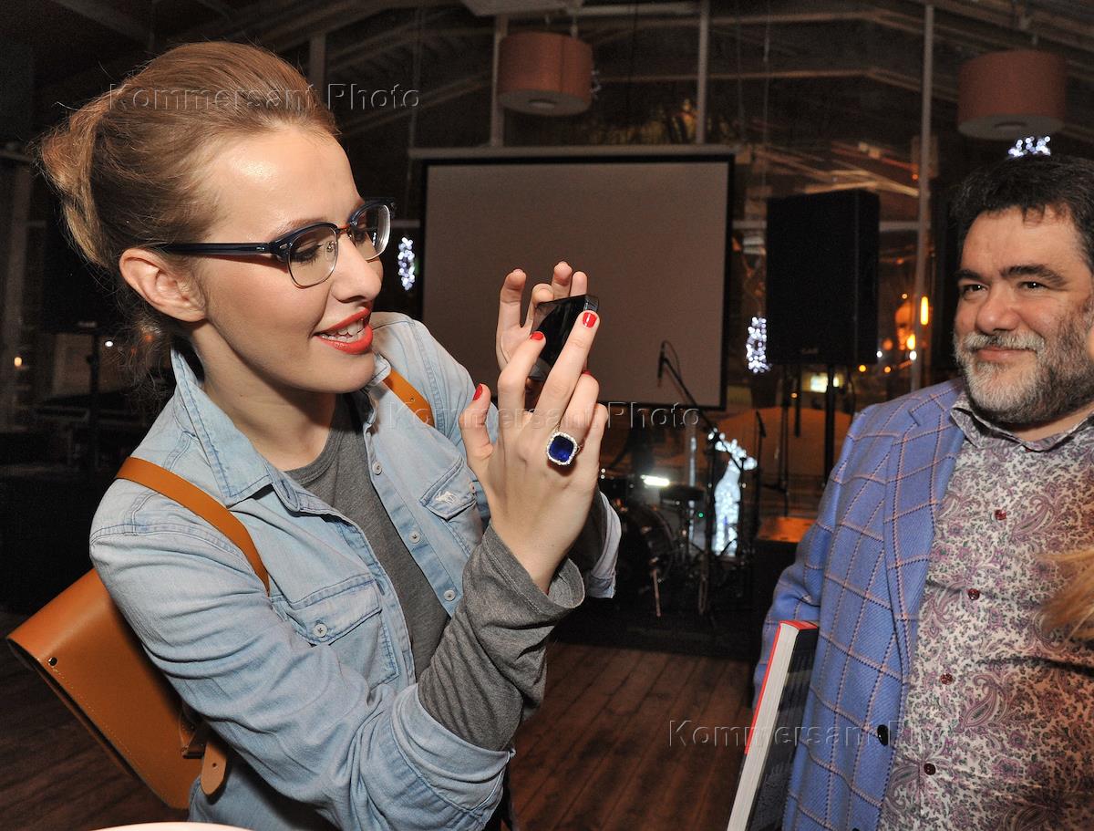 Телеведущая, главный редактор журнала SNC Ксения Собчак (слева) и председатель наблюдательного совета компании Bosco di Ciliegi Михаил Куснирович (справа) на презентации шестого тома "Намедни" Леонида Парфенова в кафе "Булка" на территории Центрального парка культуры и отдыха им. М.Горького.