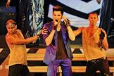 Американский певец Адам Ламберт (в центре) во время выступления на своем сольном концерте в концертном зале Crocus City Hall.