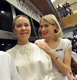 Дизайнер Ульяна Сергеенко (слева) и фотомодель Елена Перминова (справа) на благотворительной распродаже коллекций прошлых сезонов в ЦУМе.