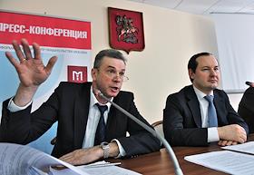 Директор Государственного унитарного предприятия "Моссовет" Александр Балабанов (слева) и руководитель департамента топливно-энергетического хозяйства города Москвы Павел Ливинский (справа) на пресс-конференции "Освещение в Москве. Итоги работы в 2012 году. Планы на 2013 год". Пресс-конференция прошла в мэрии города.