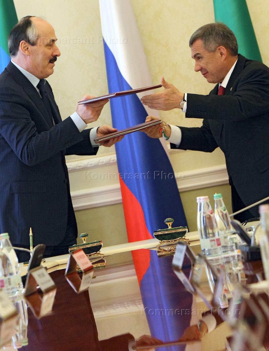 Встреча Президента Республики Татарстан Рустама Минниханова с временно исполняющим обязанности Президента Республики Дагестан Рамазаном Абдулатиповым в Казанском Кремле и подписание соглашений о торгово-зкономическом сотрудничестве Татарстана и Дагестана.