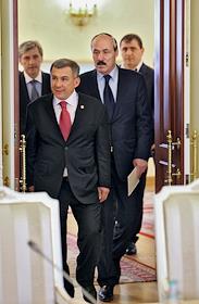 Президент Республики Татарстан Рустам Минниханов (второй слева) и исполняющий обязанности президента Республики Дагестан Рамазан Абдулатипов (второй справа) во время встречи. Встреча прошла в Казанском Кремле.