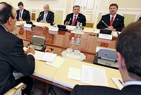 Председатель Государственного совета Республики Татарстан (РТ) Фарид Мухаметшин (третий слева) и заместитель председателя правительства РТ, министр промышленности и торговли РТ Равиль Зарипов (третий справа) во время встречи президента Республики Татарстан Рустама Минниханова (в центре) во время встречи с временно исполняющим обязанности президента Республики Дагестан Рамазаном Абдулатиповым. Встерча прошла в Казанском Кремле.