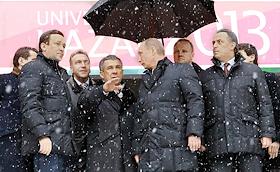 Визит президента России Владимира Путина в Казань. Слева направо: премьер-министр Татарстана Ильдар Халиков, первый заместитель председателя правительства России Игорь Шувалов, президент Татарстана Рустам Минниханов, президент России Владимир Путин и министр спорта России Виталий Мутко во время посещения футбольного стадиона "Казань-Арена", где пройдут церемонии открытия и закрытия Универсиады 2013 .