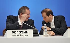 Военно-промышленная конференция "Актуальные вопросы развития оборонно-промышленного комплекса Российской Федерации". Заместитель председателя правительства России Дмитрий Рогозин (слева) и министр промышленности и торговли России Денис Мантуров (справа) во время конференции в Большом зале Дома правительства России.