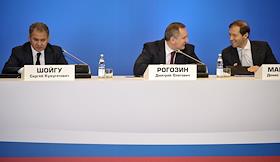 Военно-промышленная конференция "Актуальные вопросы развития оборонно-промышленного комплекса Российской Федерации". Слева направо: министр обороны России Сергей Шойгу, заместитель председателя правительства России Дмитрий Рогозин и министр промышленности и торговли России Денис Мантуров во время конференции в Большом зале Дома правительства России.