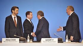 Военно-промышленная конференция "Актуальные вопросы развития оборонно-промышленного комплекса Российской Федерации". Слева направо: министр России по связям с Открытым правительством Михаил Абызов, председатель правительства России Дмитрий Медведев, министр обороны России Сергей Шойгу и заместитель председателя правительства России Дмитрий Рогозин во время конференции в Большом зале Дома правительства России.