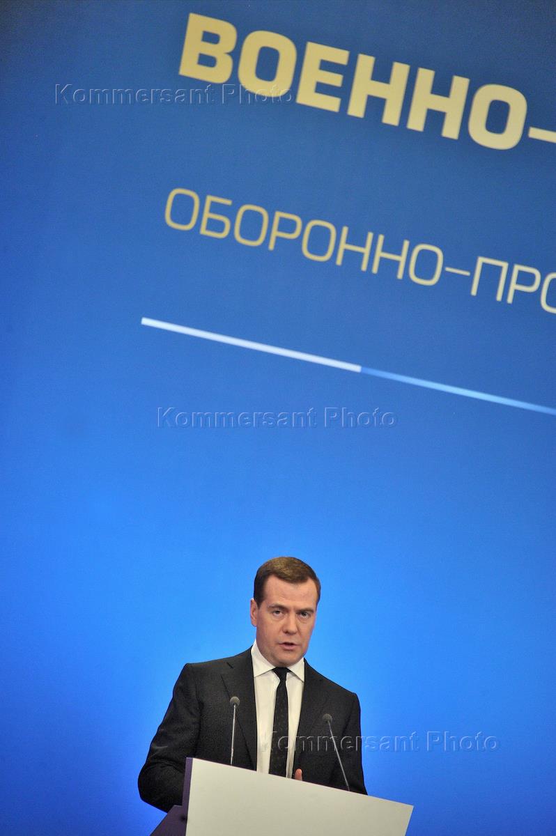 Председатель правительства России Дмитрий Медведев (в центре, за трибуной) во время заседания военно-промышленной конференции "Актуальные вопросы развития оборонно-промышленного комплекса Российской Федерации". Заседание прошло в Большом зале Дома правительства России.