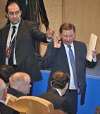 Военно-промышленная конференция "Актуальные вопросы развития оборонно-промышленного комплекса Российской Федерации". Заместитель председателя правительства России Дмитрий Рогозин (слева) и министр промышленности и торговли России Денис Мантуров (справа) во время конференции в Большом зале Дома правительства России.