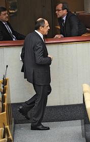 Генеральный прокурор России Юрий Чайка (слева) и министр иностранных дел России Сергей Лавров (справа) на пленарном заседании Государственной думы России.