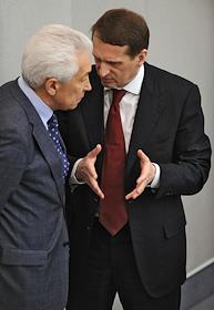 Председатель Государственной думы России Сергей Нарышкин (справа) и его заместитель Владимир Васильев (слева) на пленарном заседании Госдумы.