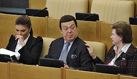 Слева направо: член комитета Государственной думы (ГД) России по физической культуре, спорту и делам молодежи Алина Кабаева, член Комитета ГД России по культуре Иосиф Кобзон, член комитета ГД по международным делам Валентина Терешкова на пленарном заседании Госдумы.